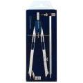 Compasso con vite centrale e tasti per regolazione rapida a frizione, aste snodate, in astuccio con prolunga, tubetto mine e innesto universale per compassi, morsetto a vite per tutte le penne