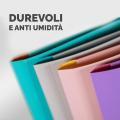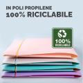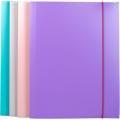 Cartelline a tre lembi reversibili. Doppio colore interno/esterno. Realizzate in PPL 0,6 mm. Tre alette a cordonatura multipla sorreggono saldamente qualunque tipo di documento in formato A4. Chiusura con elastico. Indistruttibili e 100% riciclabili, resistenti all'umidità. Confezione da 4 colori assortiti: viola/fucsia, celeste/sabbia, acquamarina/arancio, rosa/giallo.