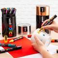 Marcatore a tempera con inchiostro pigmentato a base d'acqua, resistente alla luce e all'acqua. Atossico, inodore, non macchia, non passa la carta. Alto potere coprente e colori intensi, miscelabili e acquerellabili. Dotato di pratica punta tonda media con spessore tratto da 2,5 mm, questo uni posca è perfetto per scrivere su tutte le superfici come carta, cartoncini colorati, plastica, vetro, metallo e tessuti. Inoltre, grazie al suo particolare packaging a forma di maxi uni posca con cappuccio bronzo e fusto nero, è perfetto da posizionare sulla scrivania per tenere in ordine i marcatori o come idea regalo.